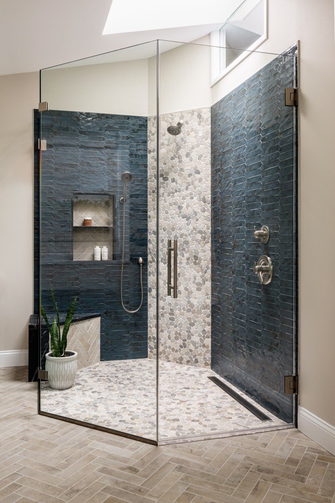The curb-less shower in the primary bath features a dark blue hand painted picket tile and pebble on the floor and shower head wall. Behind the vanity sink we installed ledger stone, which was also used to clad the fireplace in the dining room. The functional medicine cabinets feature LED mirrors which are lit around the perimeter, providing light where it’s needed.
