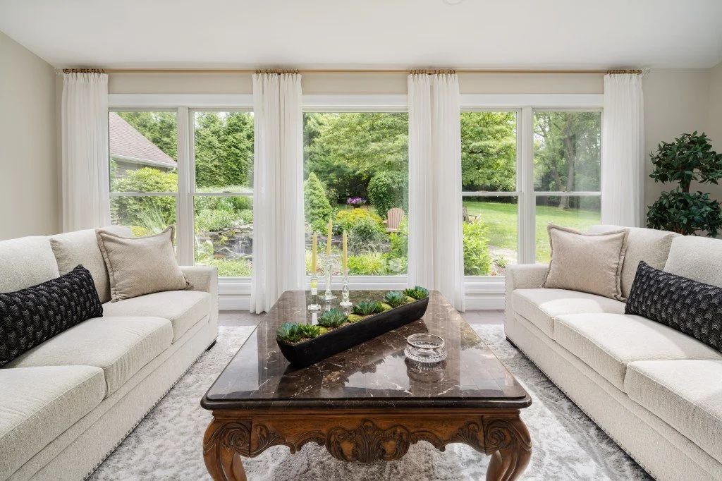 Sitting Room: The new sitting room has a modern, elongated gas fireplace, which we surrounded with Perla Venita leathered quartzite and wood paneling. A built-in, frameless mirror reflects the beautiful windows on the opposite wall. We found gorgeous crystal sconces, and loved them so much that we repeated the crystal look in the finals for the window treatments. The sheer window treatments are meant to finish off the space and softly diffuse the light, but not obstruct any of the views. Two sofas are arranged so that either the fireplace or the garden and pond outside can be viewed, and they also create a nice conversation area.