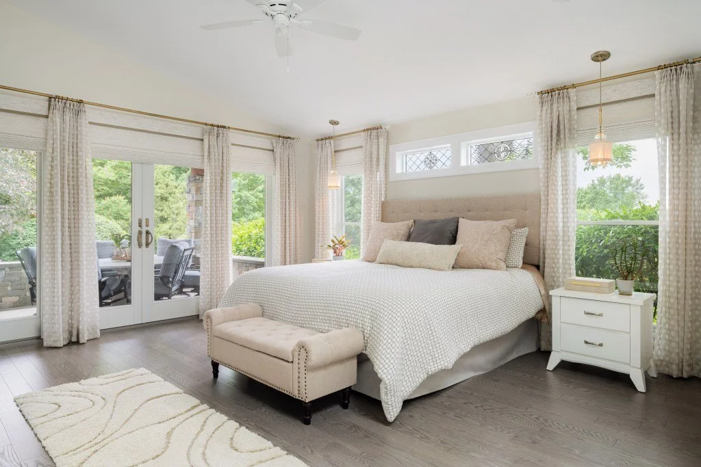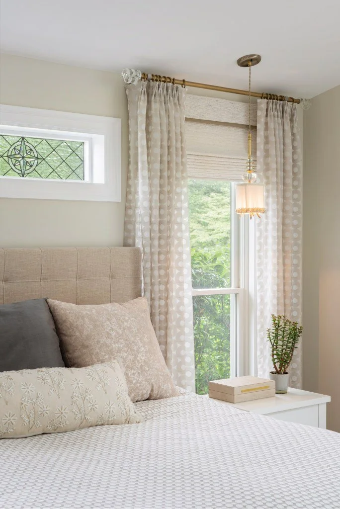 Primary Bedroom: In the primary bedroom, which is adjacent to the sitting room, more lights and finials with crystal carried the theme through as well as layered window treatments. We used the sheers for decoration and daytime privacy if needed, and the woven shades for light control. We designed the long wall to house built-in cabinetry for storage and a place for the television.