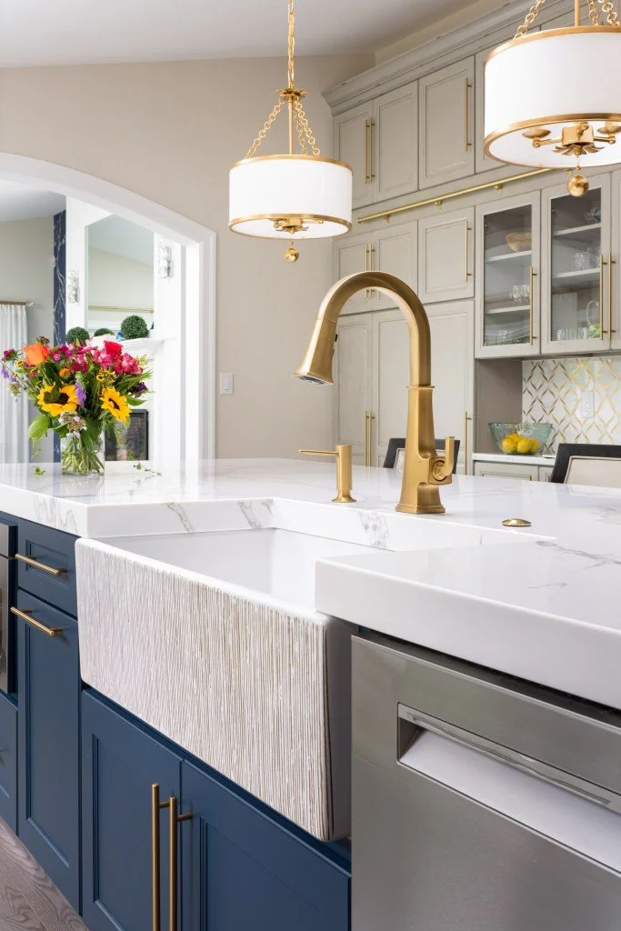 Kitchen: We decided to put floor-to-ceiling, 10’ high, 12” deep cabinets on the inside wall of the kitchen for storage of items that were previously stored in “overflow” areas outside of the kitchen. Because the ceiling peaked in this area, we needed to add a rolling ladder so that the top cabinets could be reached. Another feature of the kitchen is the large island which has storage along the back side and a built-up countertop edge to make it look even more grand and substantial. The clients wanted gold to be the theme for accents and lighting, so we found some beautiful pendants for over the island and white marble with gold inlay for the tile backsplash. The client found the modern farm sink which featured gold vertical lines on the front. The quartz countertop also has a very subtle gold color running through it.